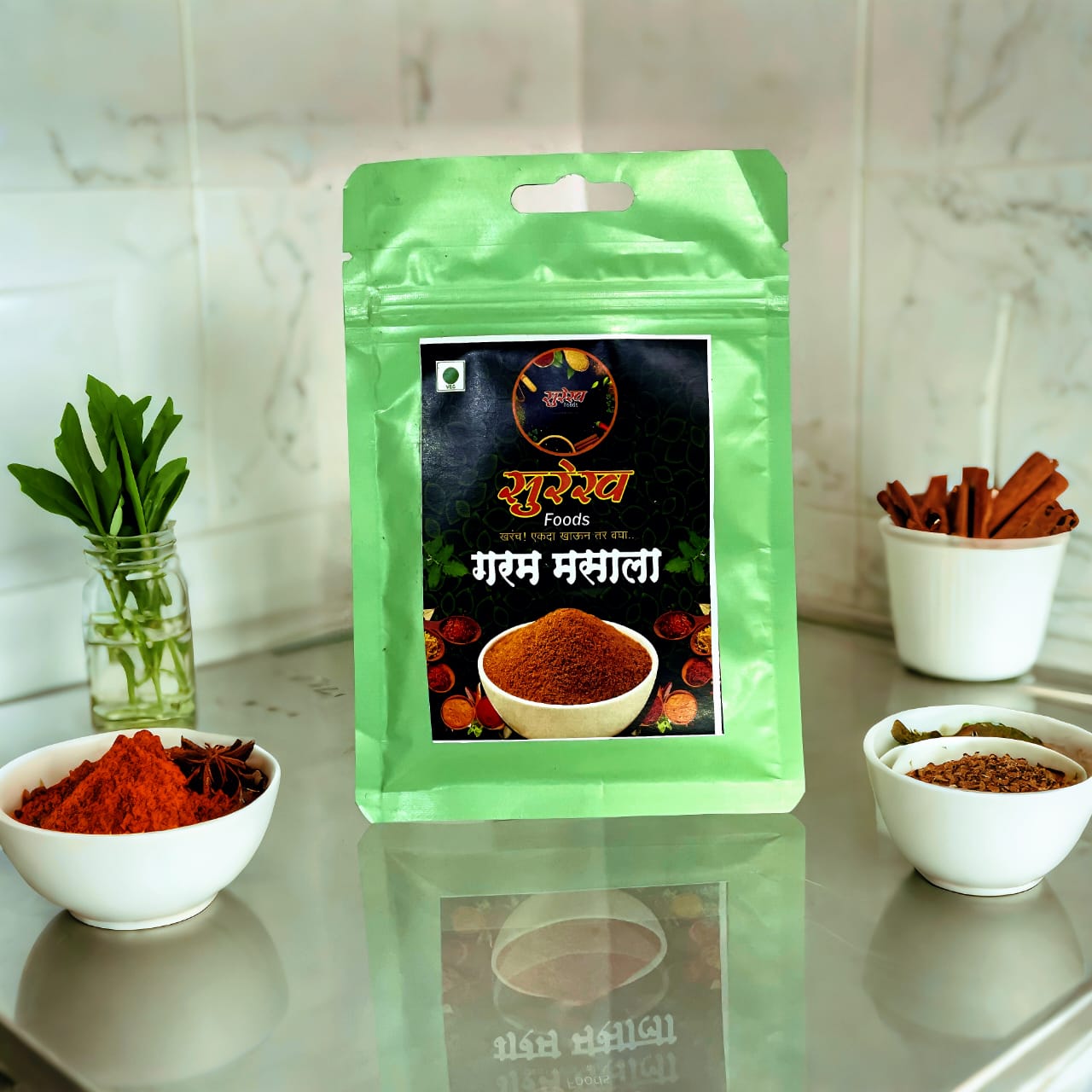 सुरेख फूड्स गरम मसाला 50gm ₹40/- मध्ये. झणझणीत आणि सुगंधी चवसाठी खास घरगुती तयार मसाला. रोजच्या जेवणासाठी योग्य!
